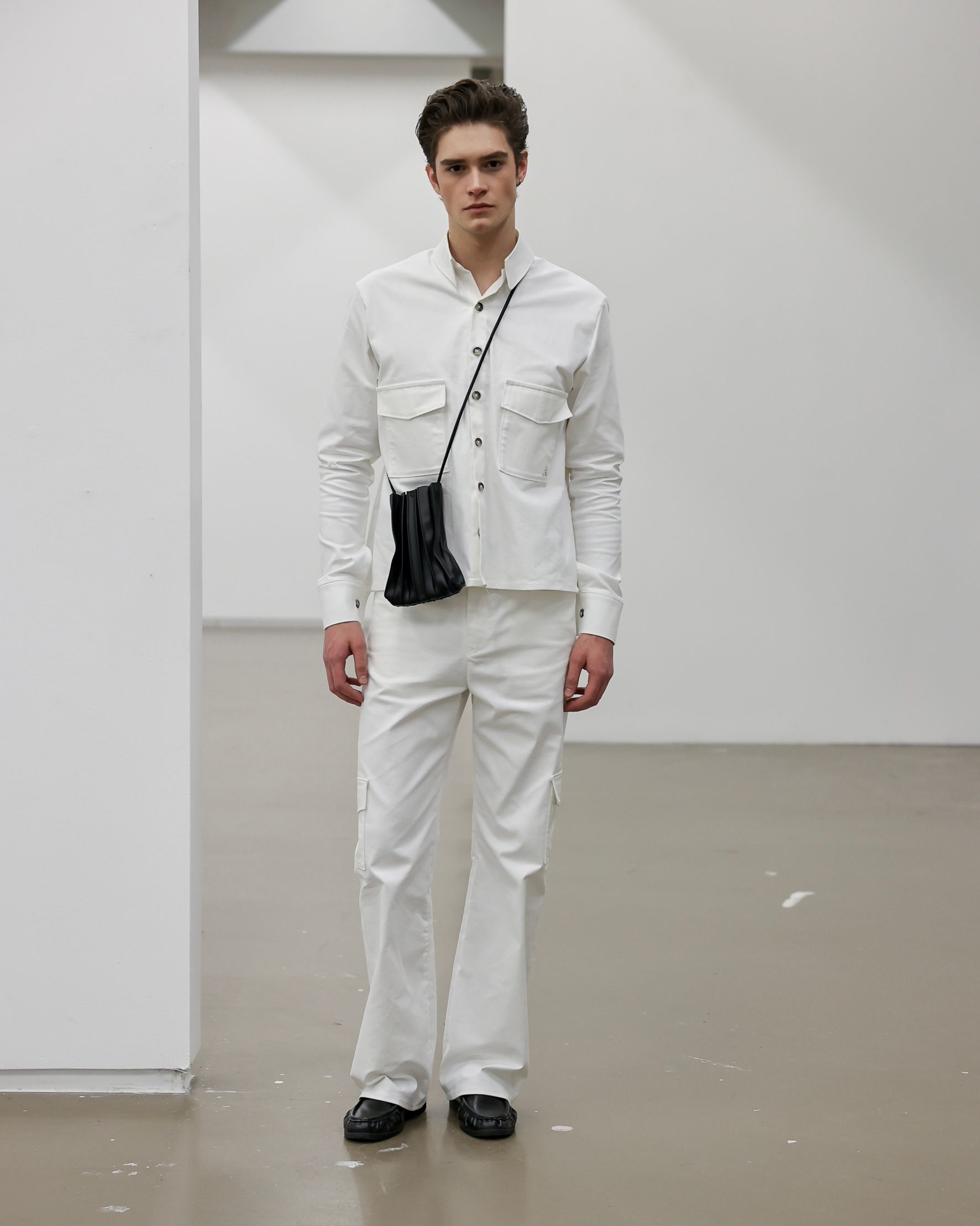 The straight denim trousers, functional and structured with side pockets, carry the essentials without excess. The white denim shirt extends the line: straight, precise, utilitarian. Only the anthracite buttons break the continuity — a discreet reminder of what has been left behind.
